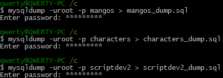 mysqldump -uroot -p scriptdev2 > scriptdev2_dump.sqlYour result should look like this: