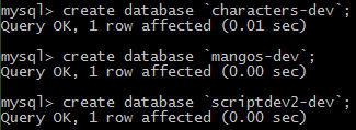 create database `scriptdev2-dev`; Your result should look like this: