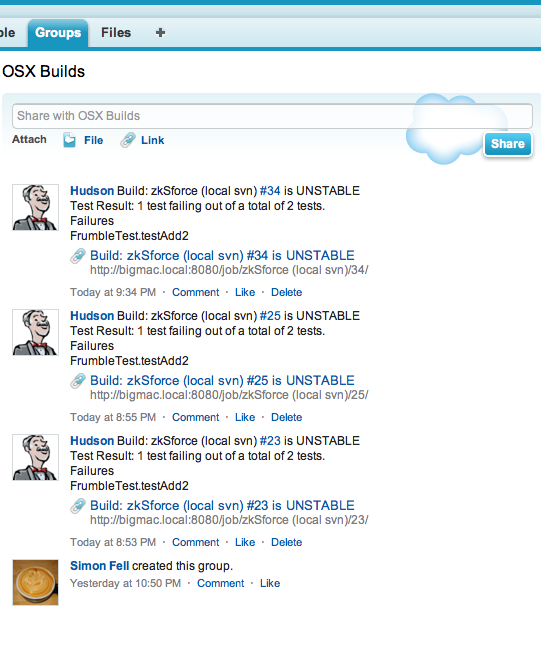 This is a plugin for Jenkins that will post build build results to a Chatter feed. You can configure it to post to a specific User (e.g. a build user), a specific group (e.g. a group that owns the build), or a specific record (perhaps you have a custom object that tracks build configs).