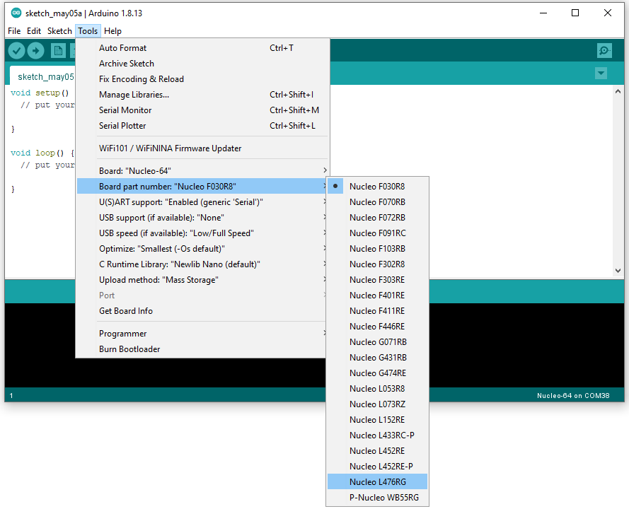 Then you can find the Nucleo-64 boards available in a sub-menu of the "Tools" menu.