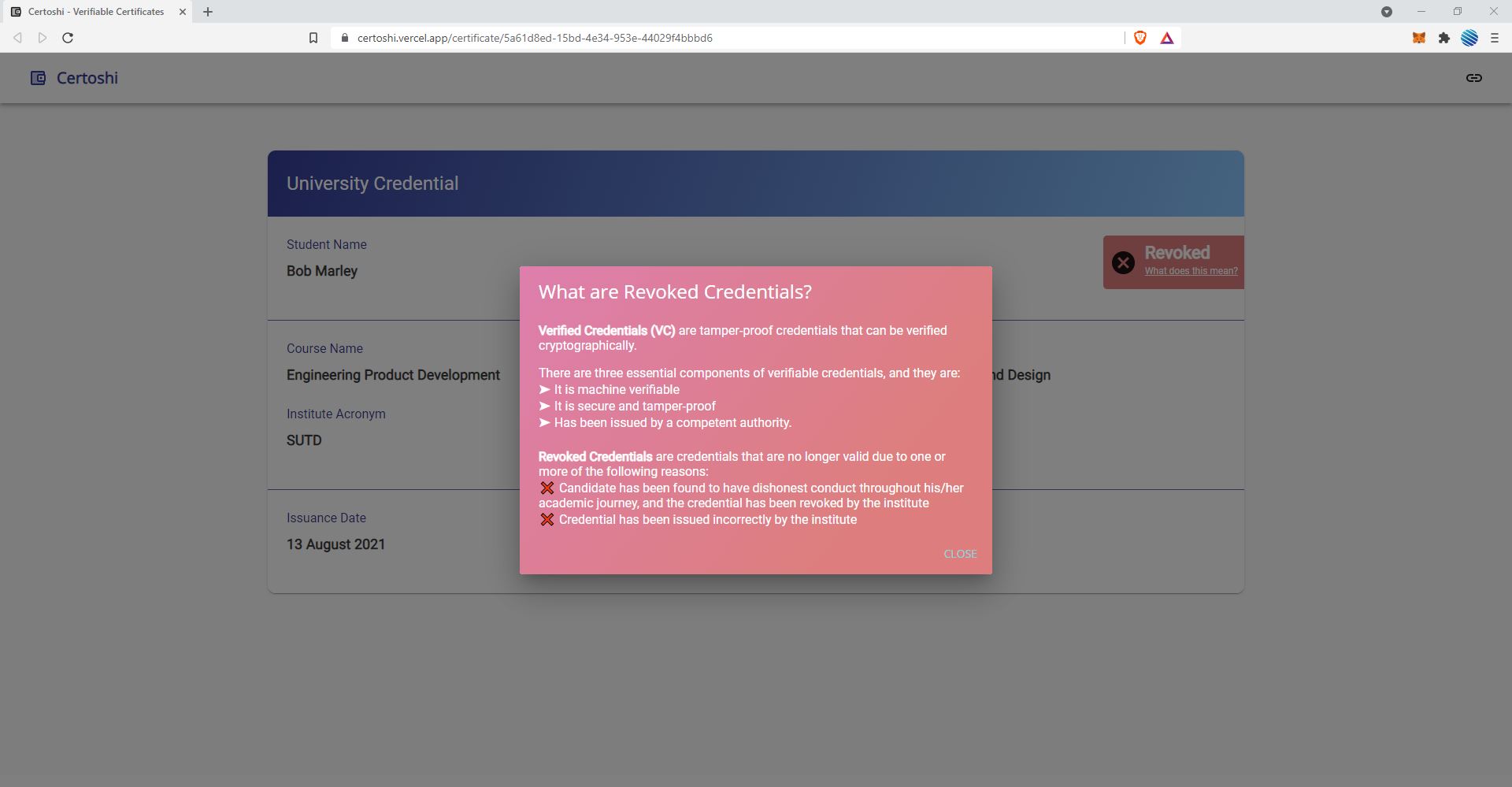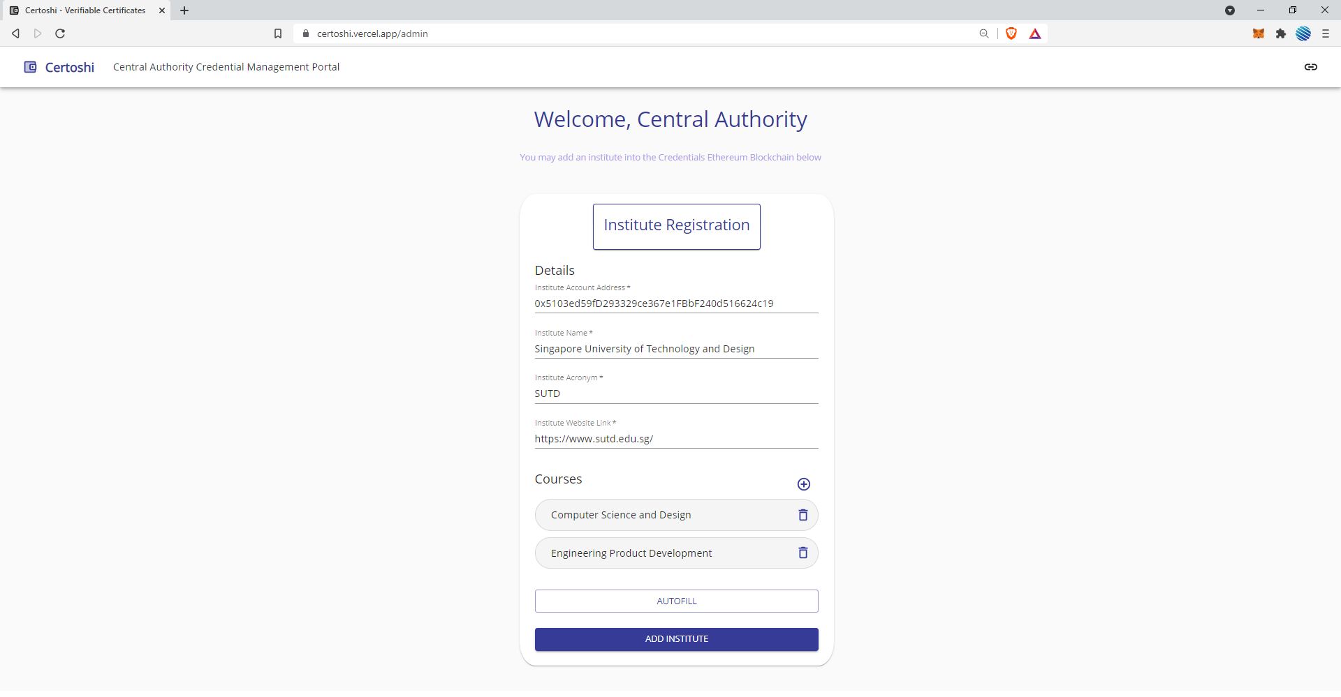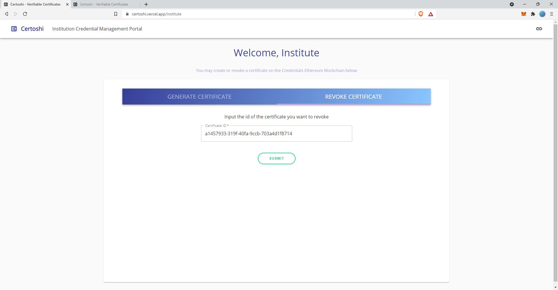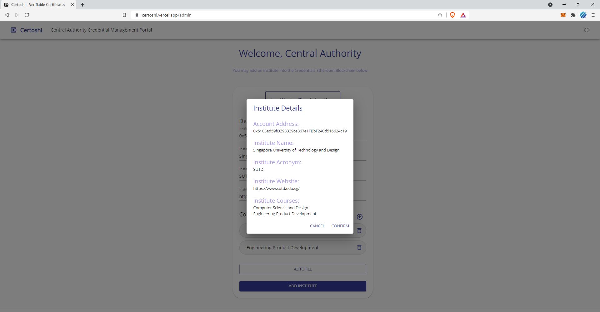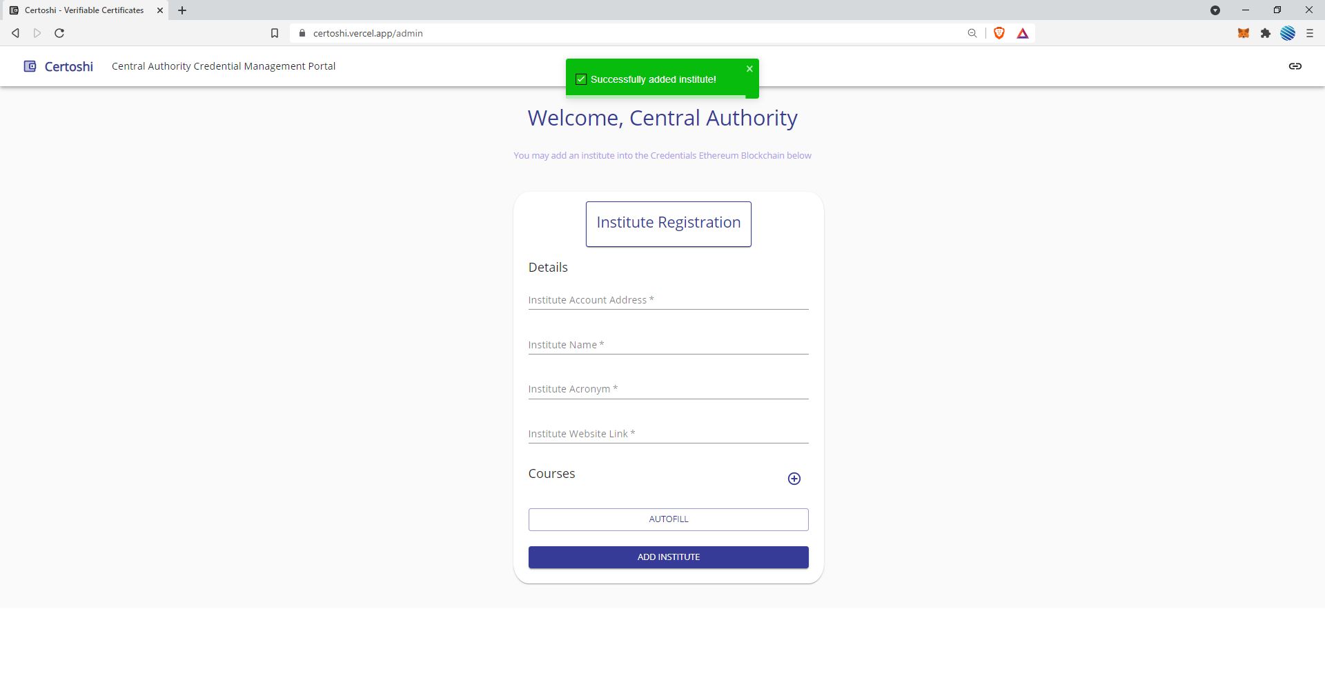 You are welcome to visit the live website connected to the Ethereum Rinkeby network at https://certoshi.vercel.app/ 😁