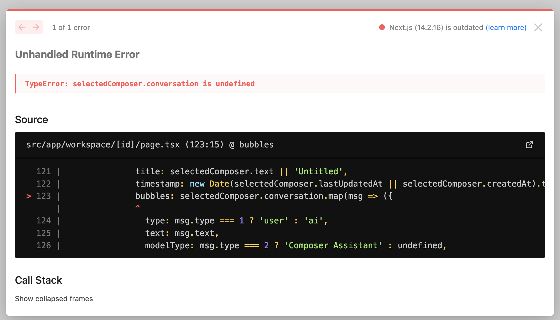 When I go to some page (for e.g. http://localhost:3201/workspace/79dbc4aff2b6a365c541230b9712118e?tab=43952348-be0e-4460-bbe0-3125596c69d3&type=composer ) it gives error `TypeError: selectedComposer.conversation is undefined`  p.s. 0.49.x See https://www.cursor.com/changelog
