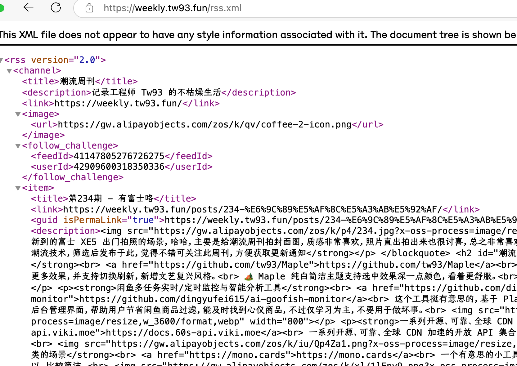 您好 RSS订阅源有换吗 我这边用的这个https://weekly.tw93.fun/rss.xml更新到230期久没更新了 只能点进网站才有 |