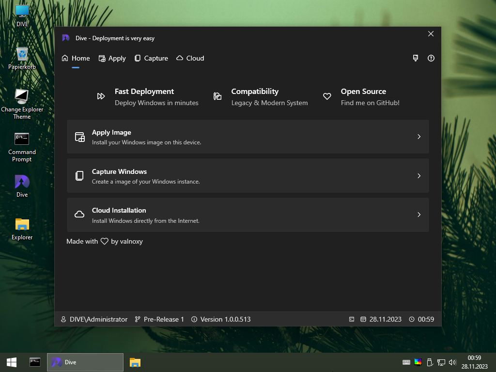 Dive (formally deploya) is a little application for deploying Windows on a machine.