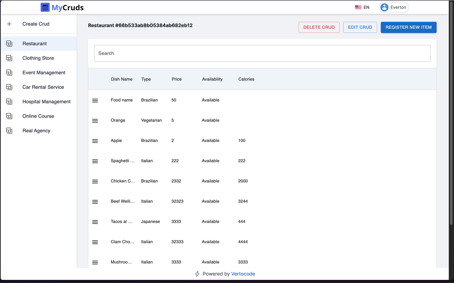 After creating a CRUD, users can access a custom list according to the field filled during the CRUD creation, and can search for items about the topic created, create new items, edit, and delete when needed. In addition, after creating a crud the edition of it is available on anytime.