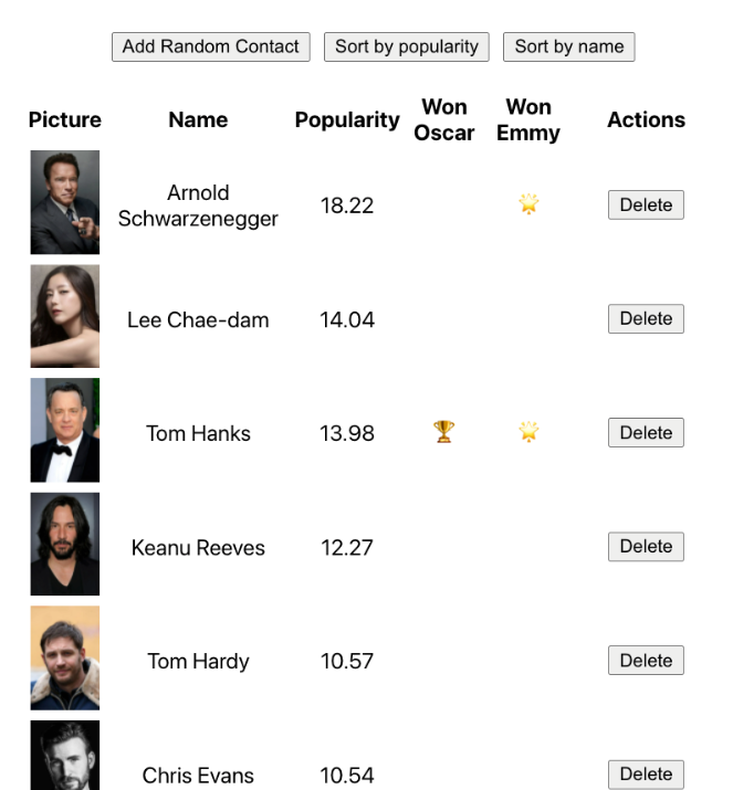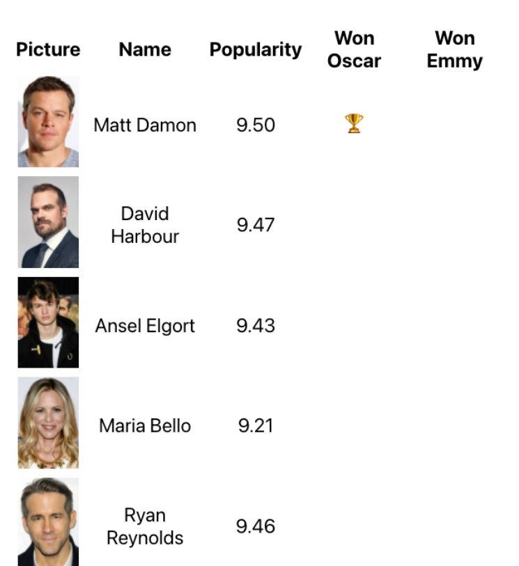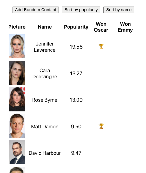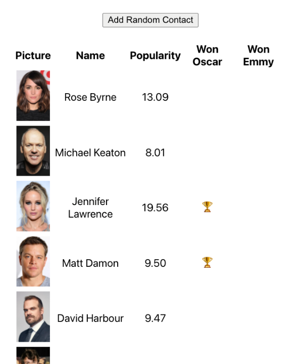 Update the list and add two more columns "Won an Oscar" and "Won an Emmy", at the end of the table. Then, depending on the value wonOscar and wonEmmy of each contact, conditionally render a trophy icon 🏆 or no content.