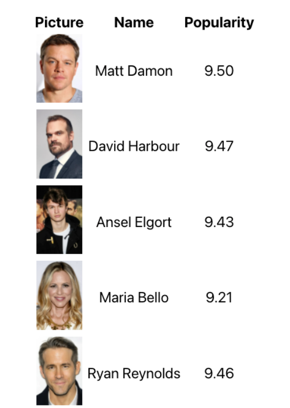 Display that array of 5 contacts as a list in a <table> and display the picture, name, and popularity of each contact.