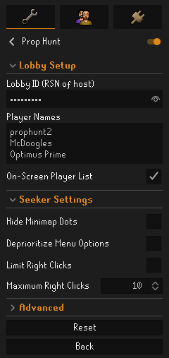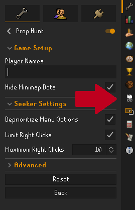 You will find the Prop Hunt panel on the side of your RuneLite client, this is the main menu used by hiders. NOTE: Hiders are encouraged to also add the player names in the config menu, but otherwise they only need to utilize this menu.