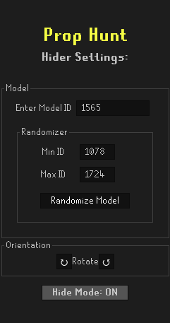 HIDE MODE Ensure this button is active if you are a hider, this will swap your model for the chosen ID.