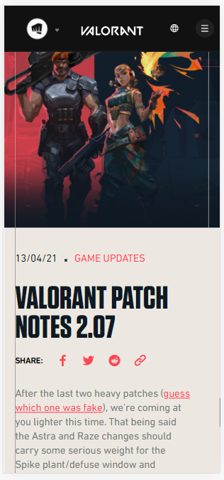 I was reading the Valorant (video game) patch notes when I realised that the patch notes were just blog posts and really liked the way they were laid out. I use a similar approach in my Blog page with the image banner continuity and share icon bar.